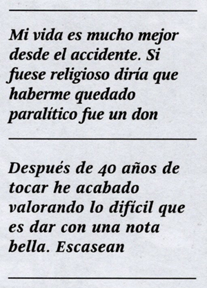 R. En un momento pensé, oh, no sé lo que pensé... ¿Sabe qué? Siento haberme enfadado de ese modo antes. Si no puedo decir algo totalmente fresco sobre algo me crispo. Porque las entrevistas me parecen interesantes. No hay dos iguales. Y aquel episodio no es que sea doloroso o dramático, es sólo que no hay nada nuevo que decir. Aunque suene chocante, yo no contemplo aquel accidente como algo malo. Fue un nuevo comienzo. Puesto que mi vida es mejor después que aquello, mucho mejor, de hecho, no lo veo como una tragedia. Es sólo un cambio. Y en mi caso, a pesar de las dificultades obvias, soy una persona más feliz. La gente que no se ha roto nunca la espalda piensa: qué terrible vivir así. Pero es algo que sucede. ¡Bang! y a otra cosa. Parecido a un animal salvaje cuando está en la jungla. Llega un helicóptero, le atrapa con una red, y al poco está en una reserva en Tanzania. Y piensa: cojones, dónde están mis amigos, mis árboles... y al final se da cuenta de que está en un lugar más seguro. Si fuese religioso, diría que fue un don. Esto me recuerda la mejor mala crítica sobre mi trabajo que nunca leí. "Como mucho nos temíamos, Wyatt se cayó aquel día sobre su cabeza" ¡risas].