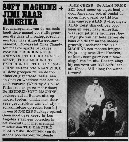 Het management van de Animals heeft deze maand voor alle groepen die daar zijn ondergebracht een toer naar Amerika georganiseerd. Ex-bassist Chas Chandler maakte aparte packages voor ERIC BURDON & THE ANIMALS + THE EIRE APARTMENT, THE JIMI HENDRIX EXPERIENCE + THE SOFT MACHINE en tenslotte ALAN PRICE. Al deze groepen zullen de top clubs en gigantiese 'hall' aan de Oost en Westkust met een bezoek vereren (Whiskey A Go-Go, Fillmore, en ga zo maar door).
