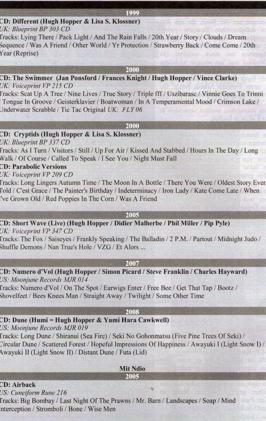 Il comporte également un tableau de références discographiques de Hugh Hopper et Karl Jenkins (ci-dessous).]