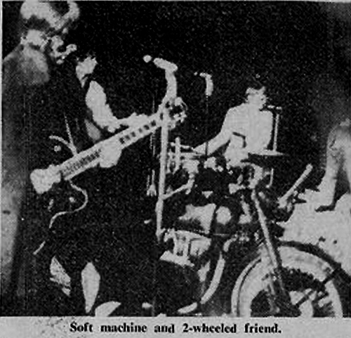 - The Soft Machine, another group with new ideas, drove a motor bike into the place, in and around the pillars that held up that gallery we had been warned wasn't all that safe... more about them too.