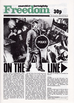 There are many anti-nuclear groups that work sometimes in tandem with CND, sometimes separately, but are not part of it, doing their own thing and not accepting the word of latterday Peggy Duffs and Canon Collinses, which is perhaps one reason why the equivalent of the Committee of 100 has not emerged. It doesn't need to. Whether to break the law or not in pursuit of Direct Action is for many people not the moral dilemma that it was for many in those days. This in itself is perhaps some small advance for the anarchist worldview. Authoritarianism and hierarchy just don't go down too well in 1982, whether it's from the offices of CND or King Street.