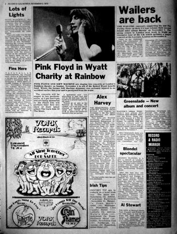 Pink Floyd in Wyatt Charity at Rainbow - Record & Radio Mirror - November 3, 1973