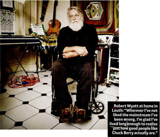 OBERT WYATT’S HOUSE IS RIGHT IN the middle of the Lincolnshire town of Louth, yet it's protected enough by its thick walls and beautifully tended garden to feel like it's in the middle of nowhere. It's only when I spot the tiny ceramic head - complete with a pair of glasses and a badge (Robin - The Boy Wonder!) - that sits almost unnoticed by the front door that I know for sure I have the right place. I can't imagine many other residents displaying a similar sense of the absurd. Inside the front door, just to the left, is Wyatt's studio. There's a crisply melodic jazz record playing, keyboards dotted around and a grand piano in the corner. A soft breeze rolls in from the road, rustling the curtains. Wyatt rolls down the corridor dressed all in black, his hair long and swept back, his beard trimmed and white as snow. Around him, every wall is covered with paintings - his wife Alfie is an artist and lyricist - and drawings and artworks. A cushion embroidered with the cover of his 1984 EP collection sits by the telephone. In the breakfast room there's a stack of vinyl under the CD player that I'm powerfully drawn to but never get to flick through as we move swiftly on to the garden where we sit around a big table under a cherry tree. Alfie's mother, Irena, who lived here too, died suddenly a few days ago and a huge bunch of white lilies has been placed on her favourite chair.